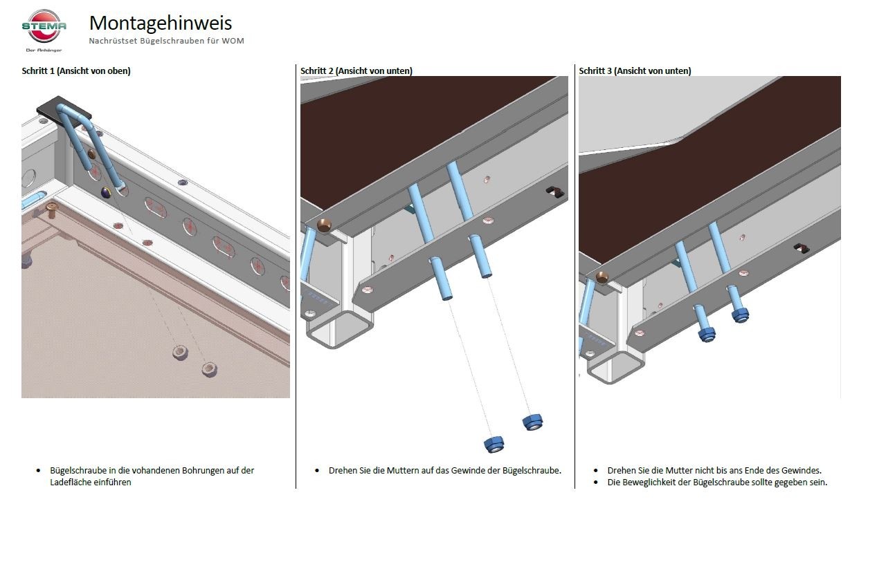 Die großen, stabilen Bügelschrauben dienen zum Verzurren Ihres Transportgutes. Je nach Anhängermodell sind diese als versenkbare Variante erhältlich und sorgen so für hindernisfreies Be- und Entladen. Die Belastbarkeit ist unterschiedlich je Modell und Ausführung.