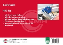 Zum Artikel ZT00696: Seilwinde 450 kg mit Gurt, 50 mm breit, 7 m lang und Haken mit Ausklinksicherung, 1-Gang, das Kunststoffgehäuse schützt die Mechanik