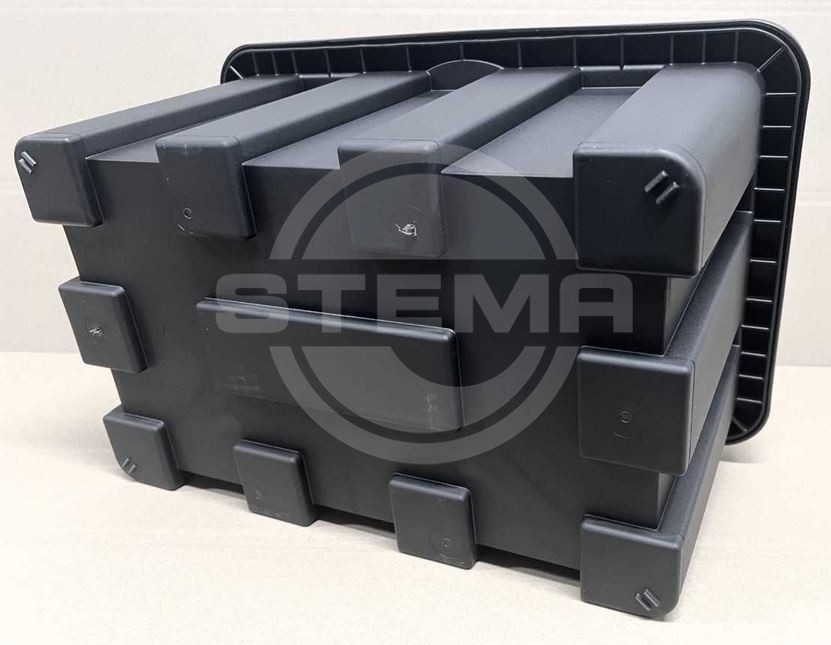 Mit einer Größe von LxBxH 500x300x350 mm, hat die Staubox ein maximales Fassungsvermögen von 27 Liter bei einer Belastbarkeit von 40 kg.