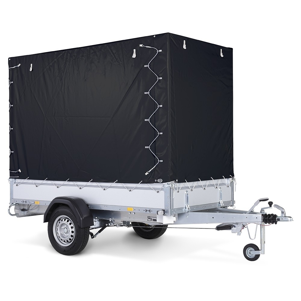 2te WAHL 185 cm Hochplane PREMIUM in SCHWARZ für STS (WOM) mit Beschriftung "Trailer Direct Eckental Art.Nr.