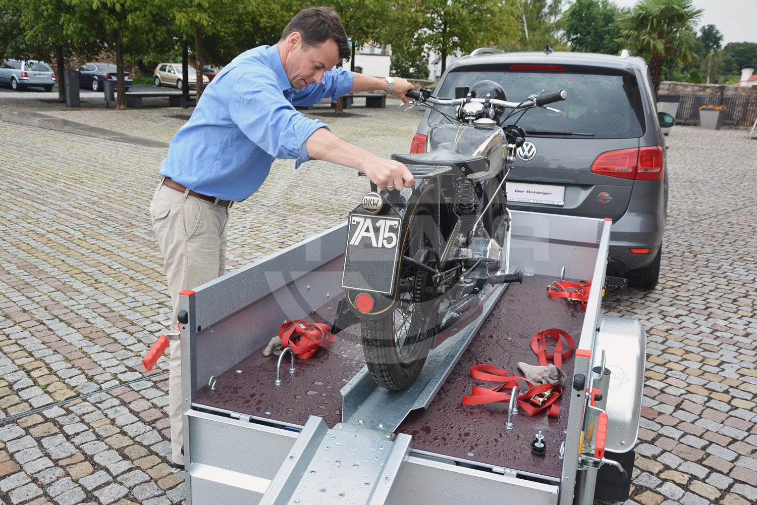 The motorcycle transport set contains everything you need for an optimal transport of your motorcycle. It includes a 400 kg access ramp with a length of 190 cm, a pair of support legs with original Stema brackets, a 195 cm long transport rail with wheel holder bracket and four round steel brackets for lashing.