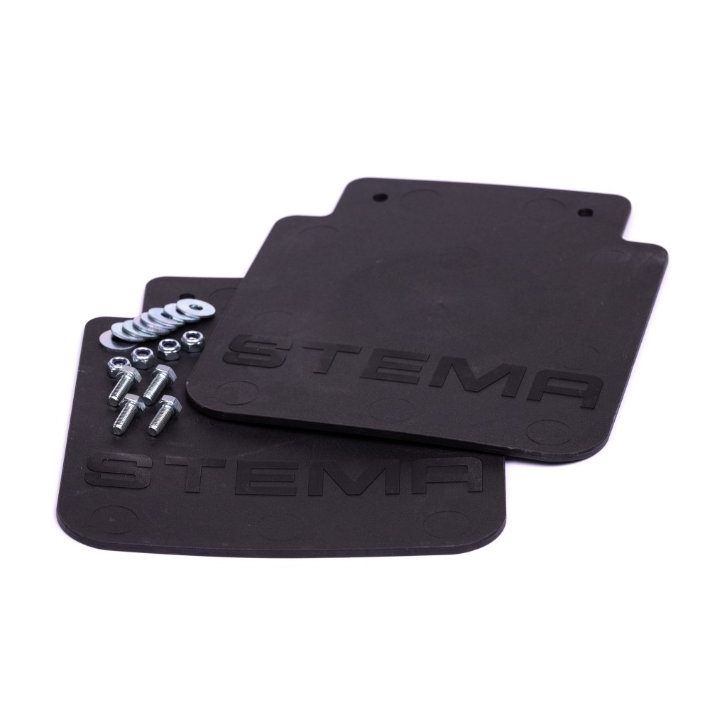 The set consists of two black rubber flaps with STEMA printing and serves to protect against splashing water. It is mounted on the fenders of the trailer.