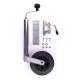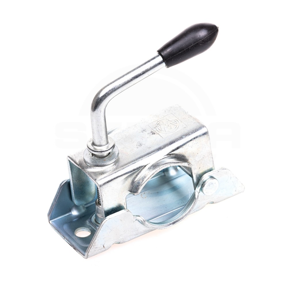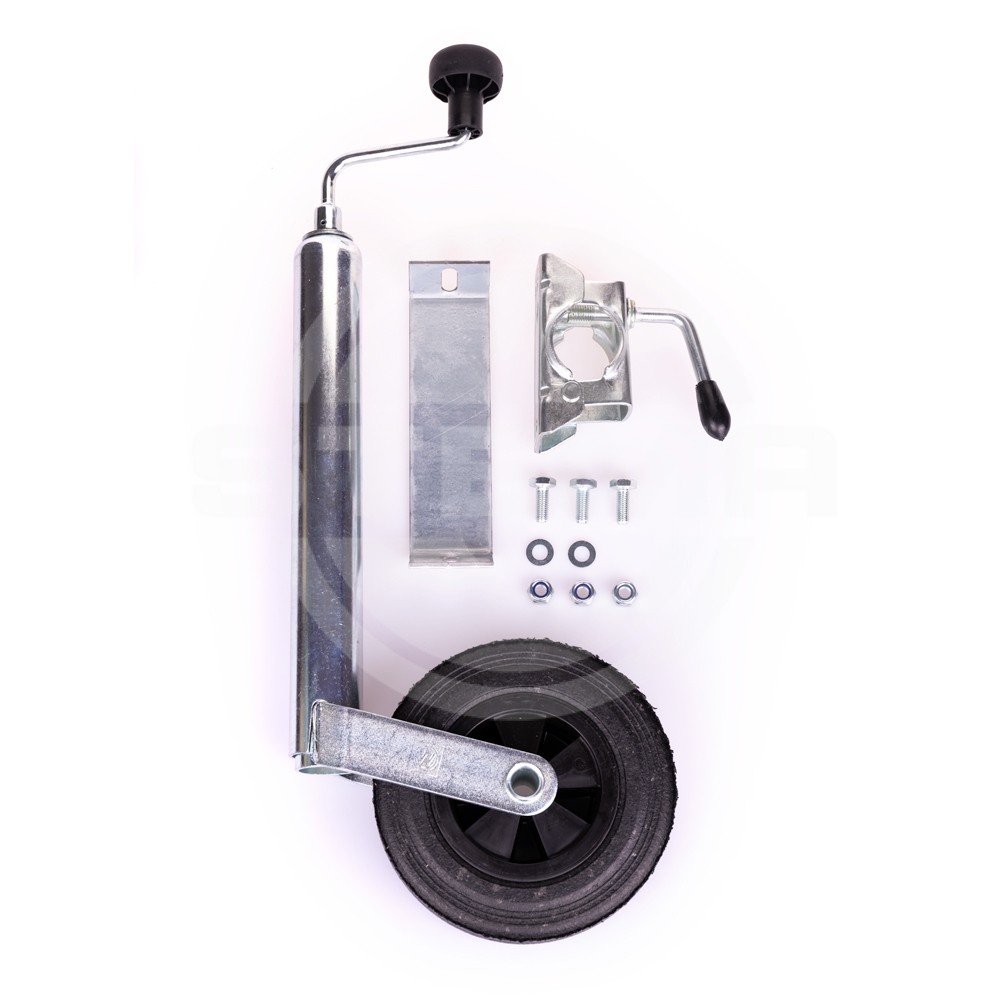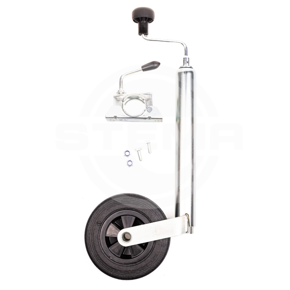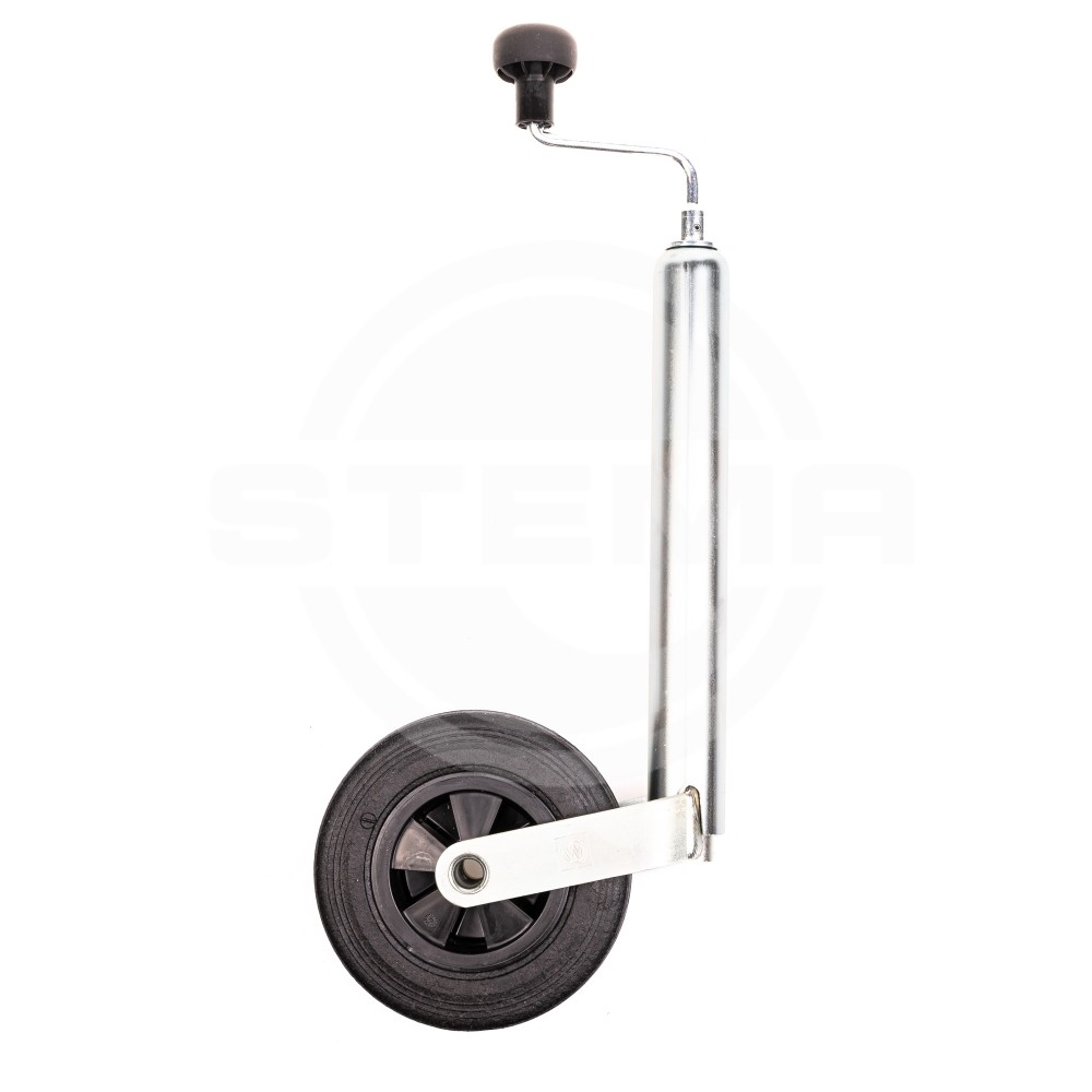 The support wheel allows for easy manoeuvring when coupling and uncoupling the trailer. The tube diameter is 4.8 cm. The wheel with solid rubber tires and plastic rim has a diameter of 20 cm. The load capacity while stationary is 150 kg.