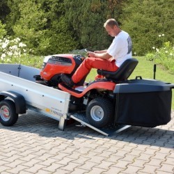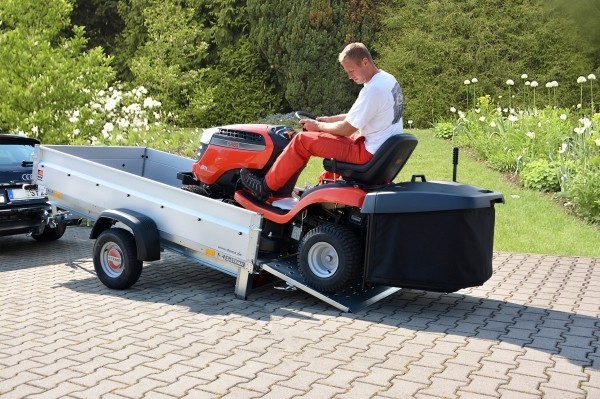 Der stufenlos verstellbare Kippwinkel sowie die kompakte Laderampe ermöglichen das einfache Verladen von Rasenmähern und -traktoren, Kehrmaschinen oder anderen Motorgeräten. Verzurrt und gesichert wird über sechs stabile im Rahmen verankerte Ösen. REX 21 und REX 25 sind außerdem mit Hochplane und Spriegel ausrüstbar - erhältlich als Anhängerzubehör. So ist Ihr Ladegut bei Wind und Wetter geschützt.