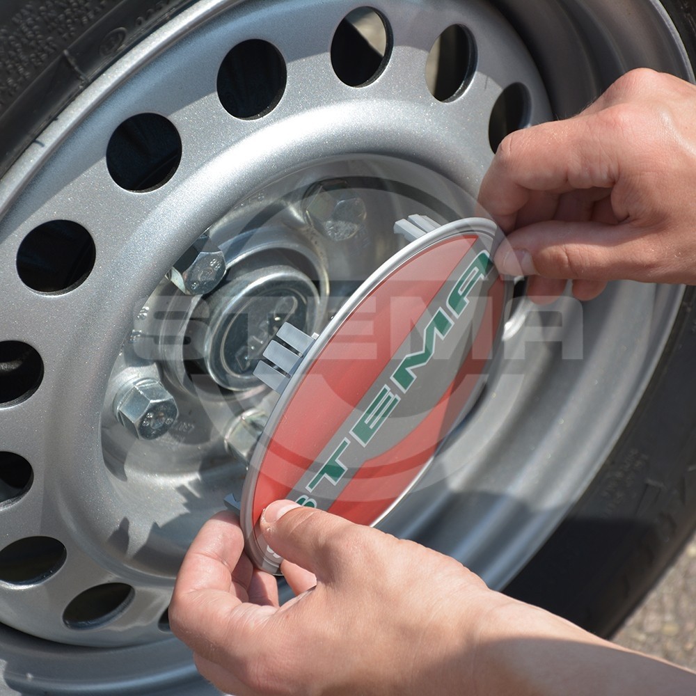 Bei dem Set handelt es sich um zwei aufsteckbare Radzierblenden, die mit dem STEMA-Logo versehen sind. Die Radkappen bestehen aus PVC.