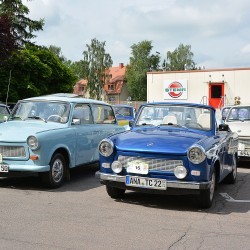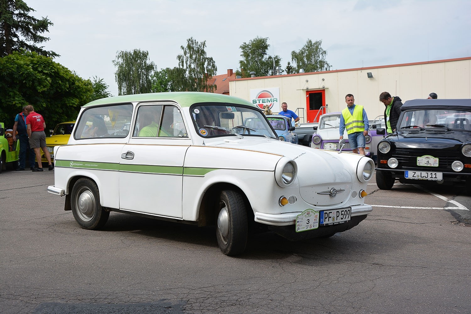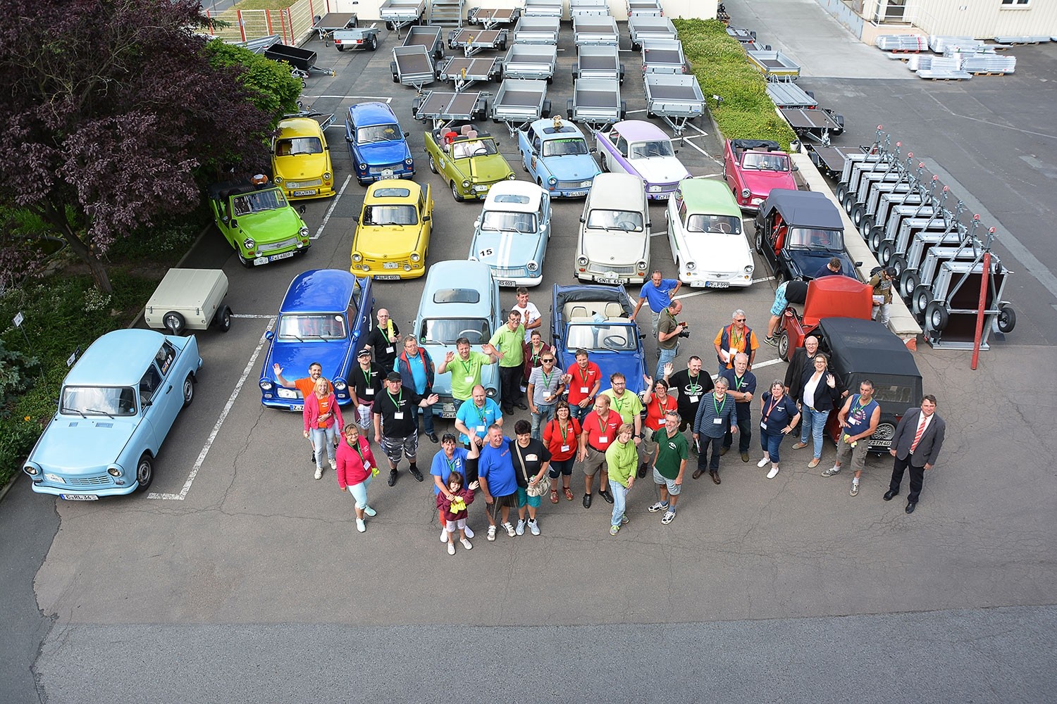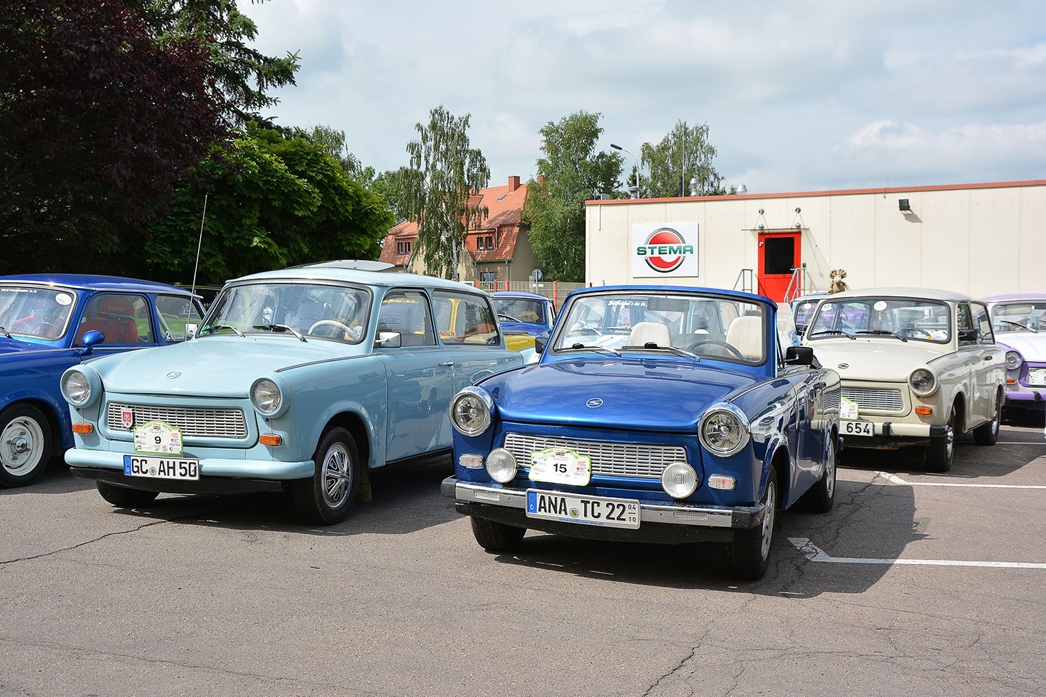 Da ist es wieder, das 2-Takter-Geräusch der Kindheit oder Jugend. Knatternd parken 20 Trabis auf dem Parkplatz der STEMA Geschäftsleitung. Aus ganz Deutschland sind sie mit ihren „Pappen“ angereist. Vom Trabant Carbrio bis hin zum Sanitäter-Trabi ist alles dabei. Sogar ein alter HP STEMA-Anhänger ist im Schlepptau und wird stolz von Trabi-Tourleiter Ralf Lemnitzer präsentiert.