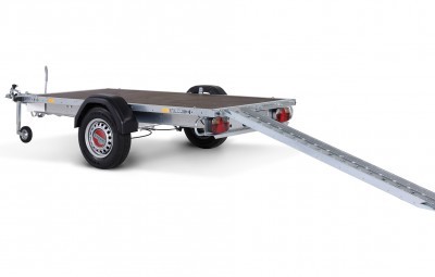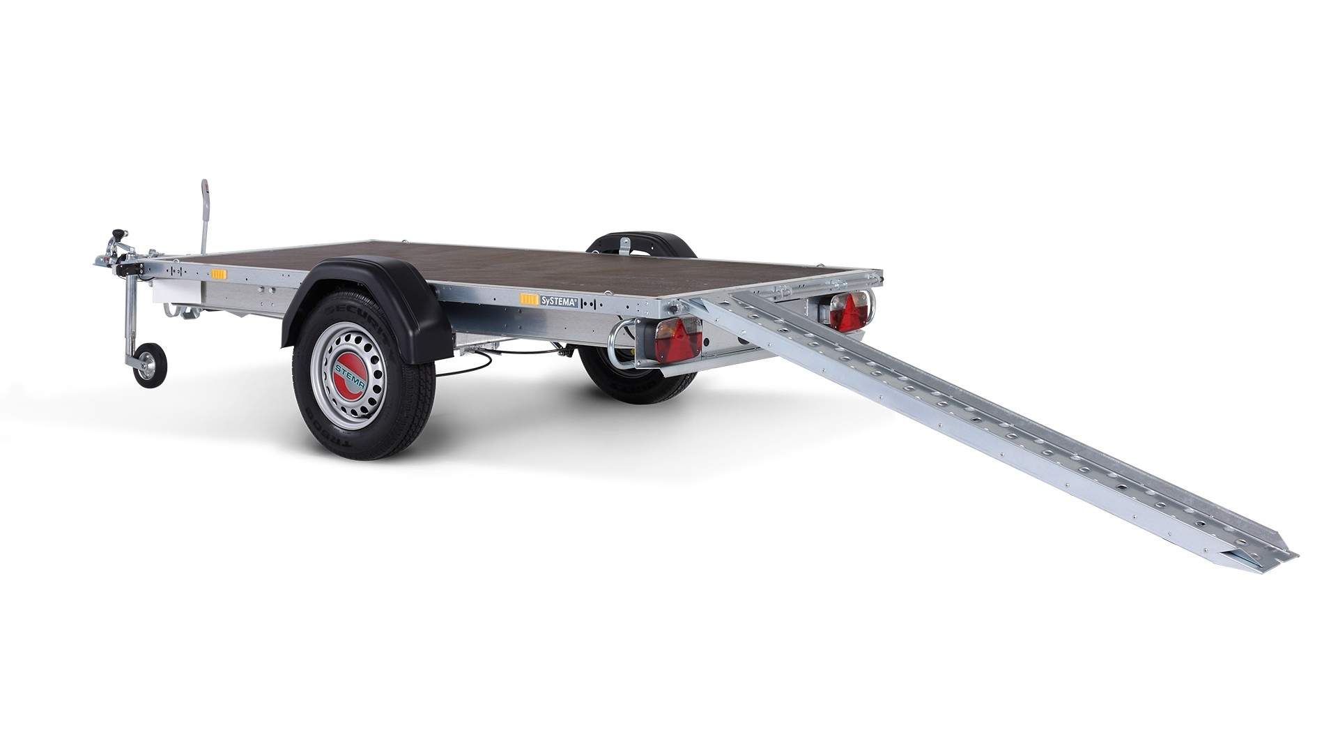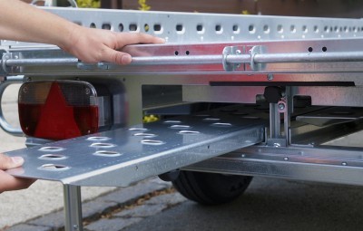 Bei jedem SySTEMA® Anhänger ist ein Fach für die Nachrüstung von Auffahrschienen vorgesehen. Die Auffahrschienen in Alu oder Stahl werden hinter dem Kennzeichenträger mit Hilfe von Gleitschienen sicher und einfach verstaut. Dies ermöglicht eine schnelle Be- und Entladung.