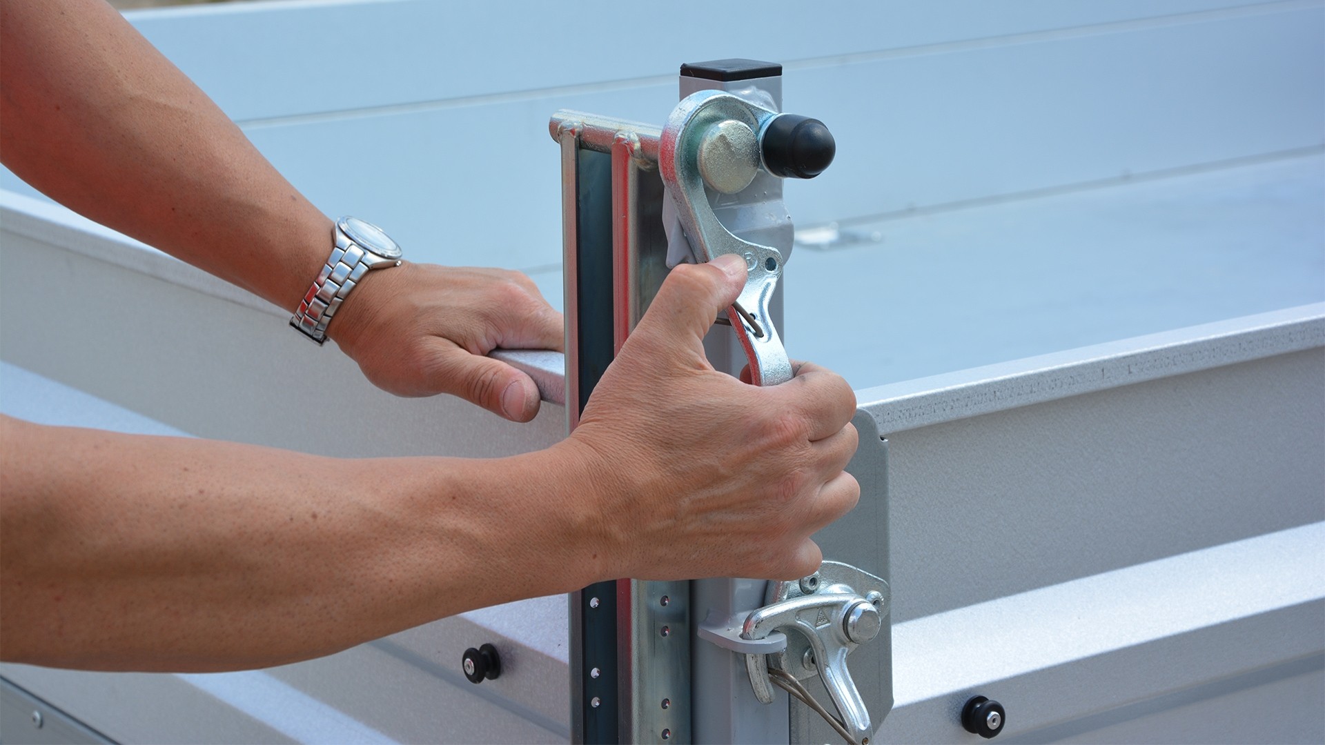 The rear wall is foldable and swingable and has stable angle lever fasteners.