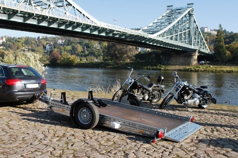 The entire platform is lowered via a pivot axis. This makes it much easier, especially for heavy motorcycles, to drive onto the platform. The Dresden Harley Chapter was already allowed to test the trailer on the Blaues Wunder (Blue Wonder Bridge) in October and was thrilled. For all motor sport fans this model will be seen and tested for the first time at the Sachsenkrad (13.-15. Jan. 2012) in Dresden.