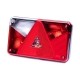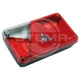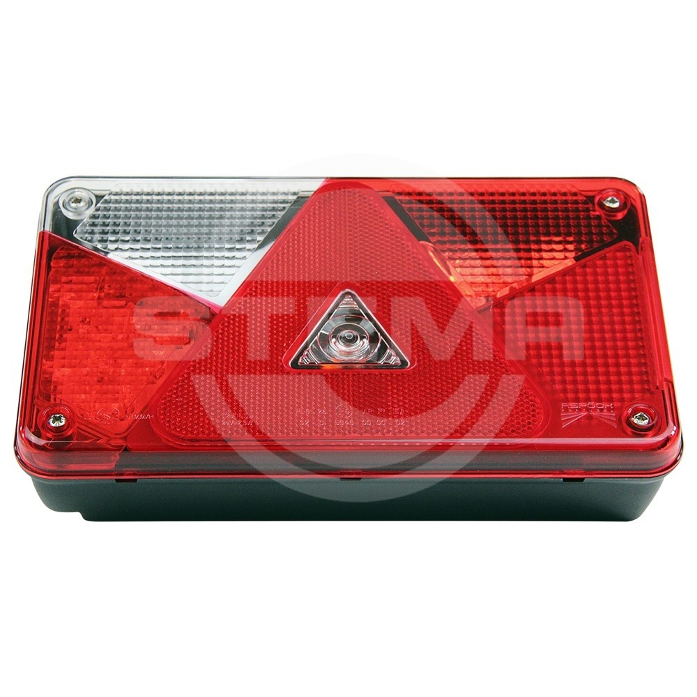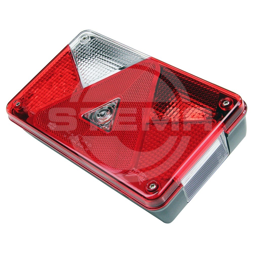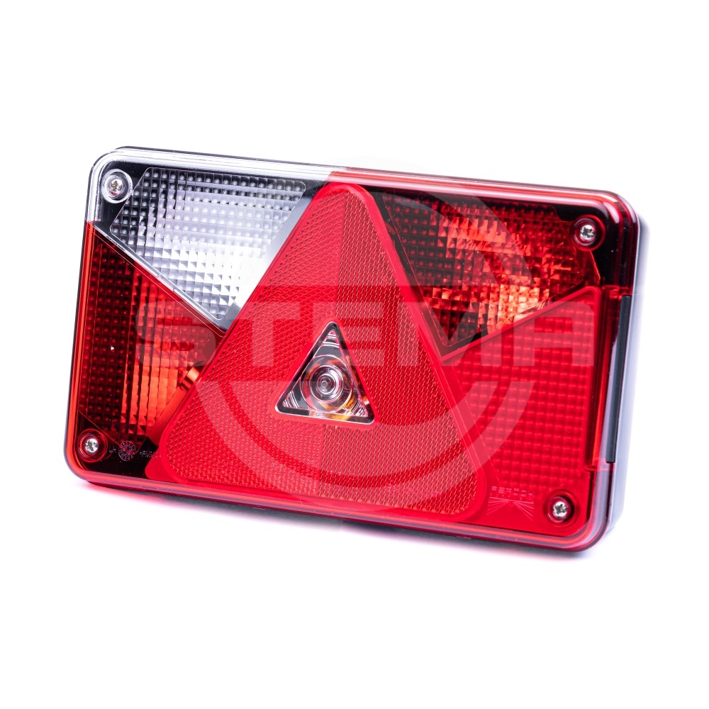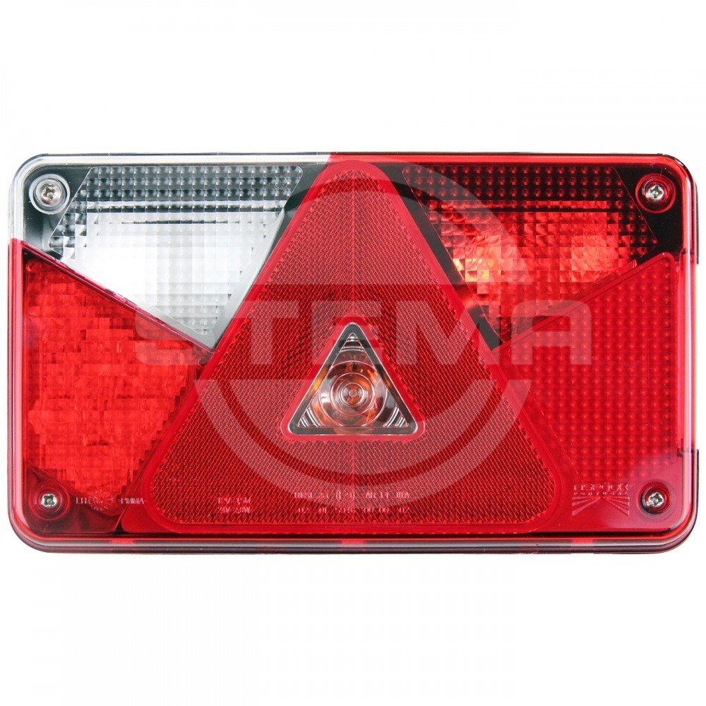 With the complete rear light you receive the housing with bulbs, light glass and 5-pole bayonet connection on the back. The right side, seen in driving direction, is equipped with blinkers, brake lights taillights, license plate lights and a triangular reflector. The left side is additionally equipped with a rear fog light.
