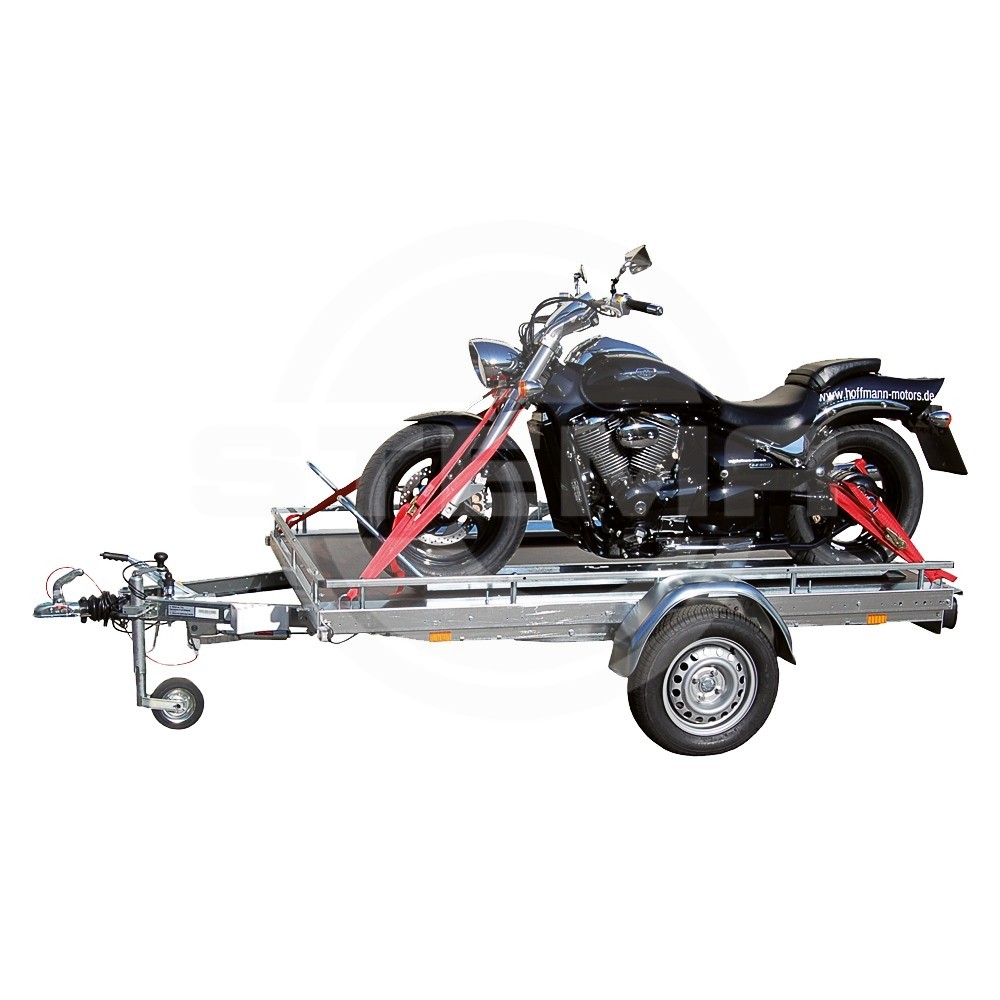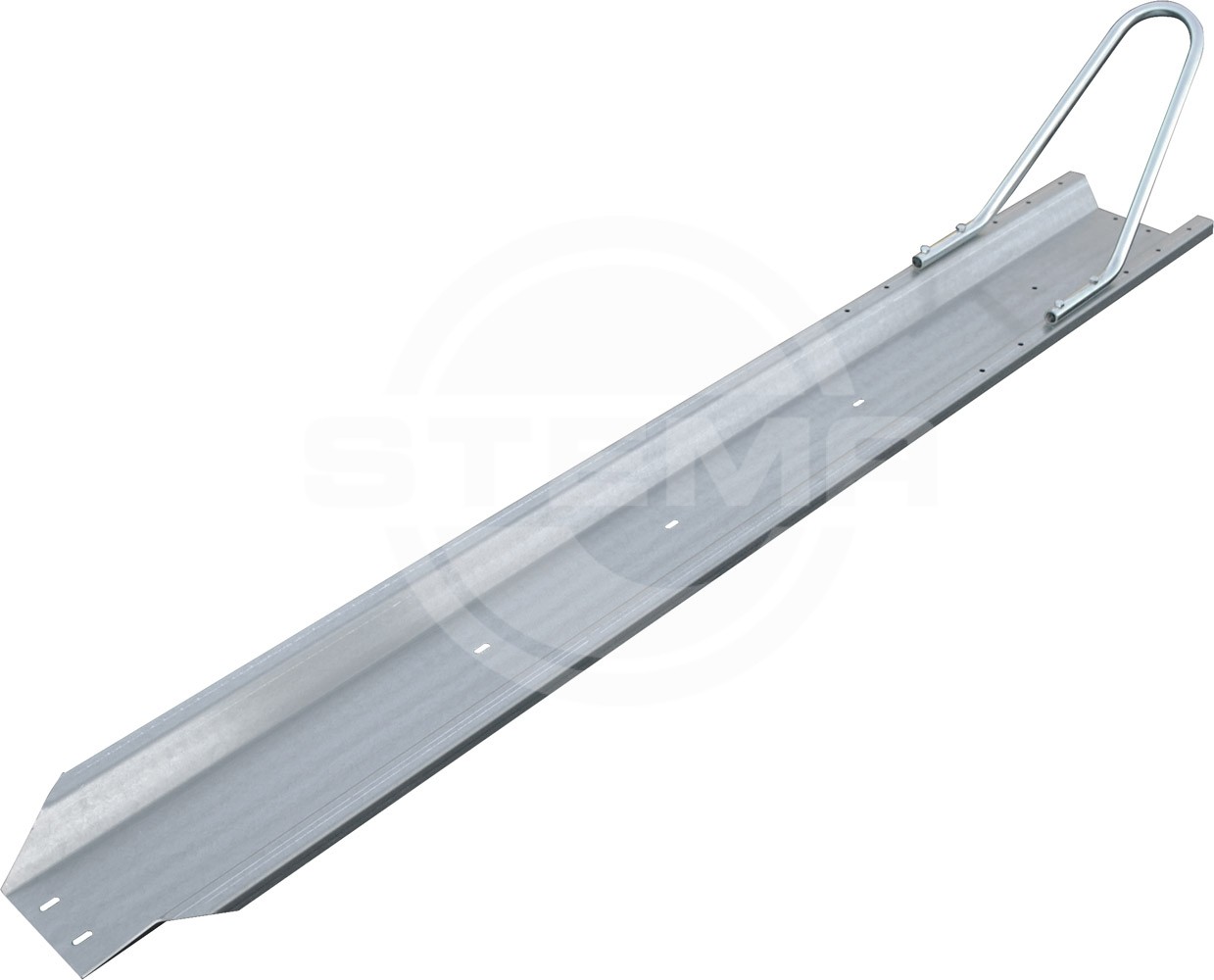 The transport rail made of galvanised sheet steel is used for transporting a motorcycle or scooter. It is mounted on the trailer floor by drilling the appropriate holes. The width of the running surface is 11.6 cm to max. 18 cm.