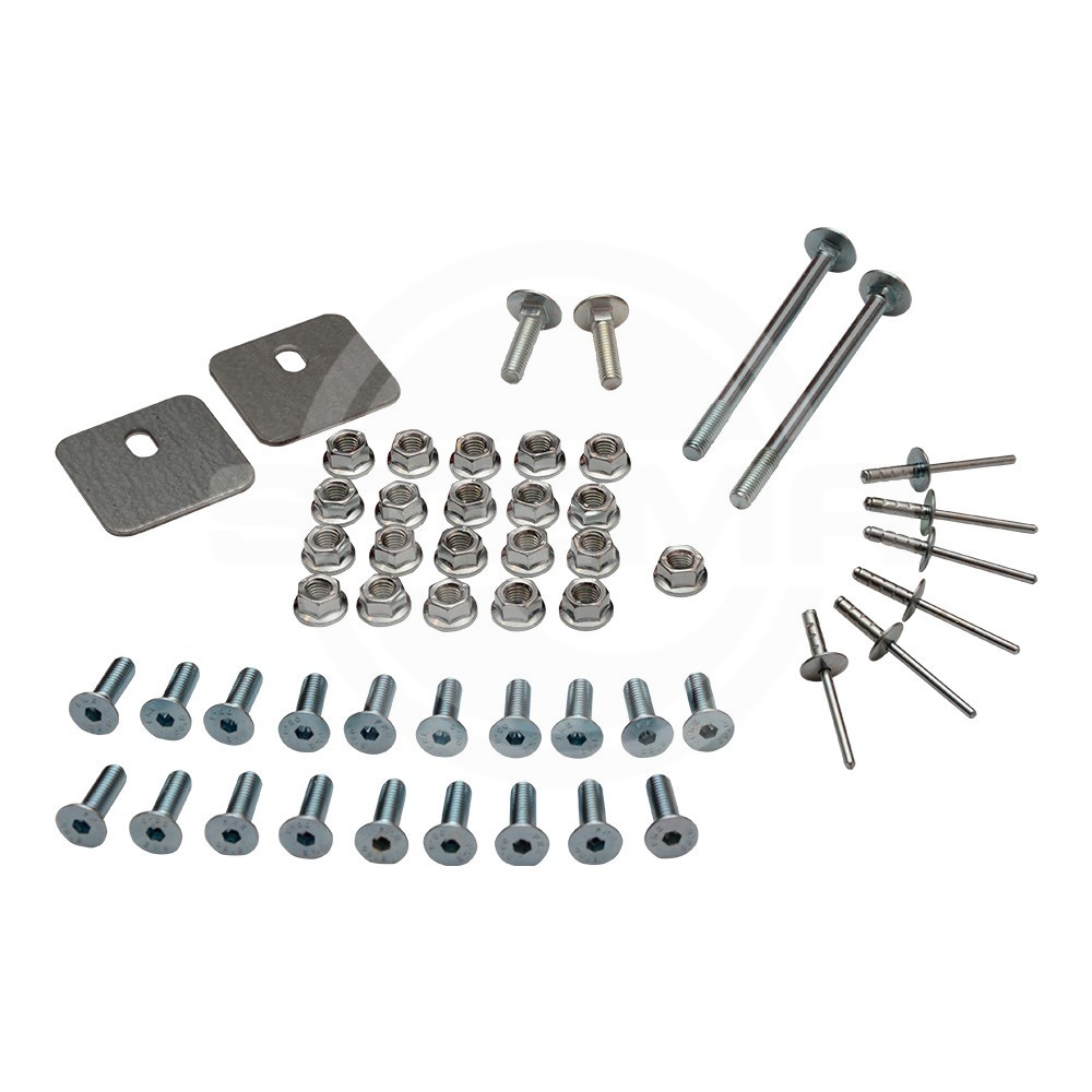The scope of delivery includes 2 square washers, 23 different screws (countersunk and cup head screws), 21 flange nuts and 6 rivets