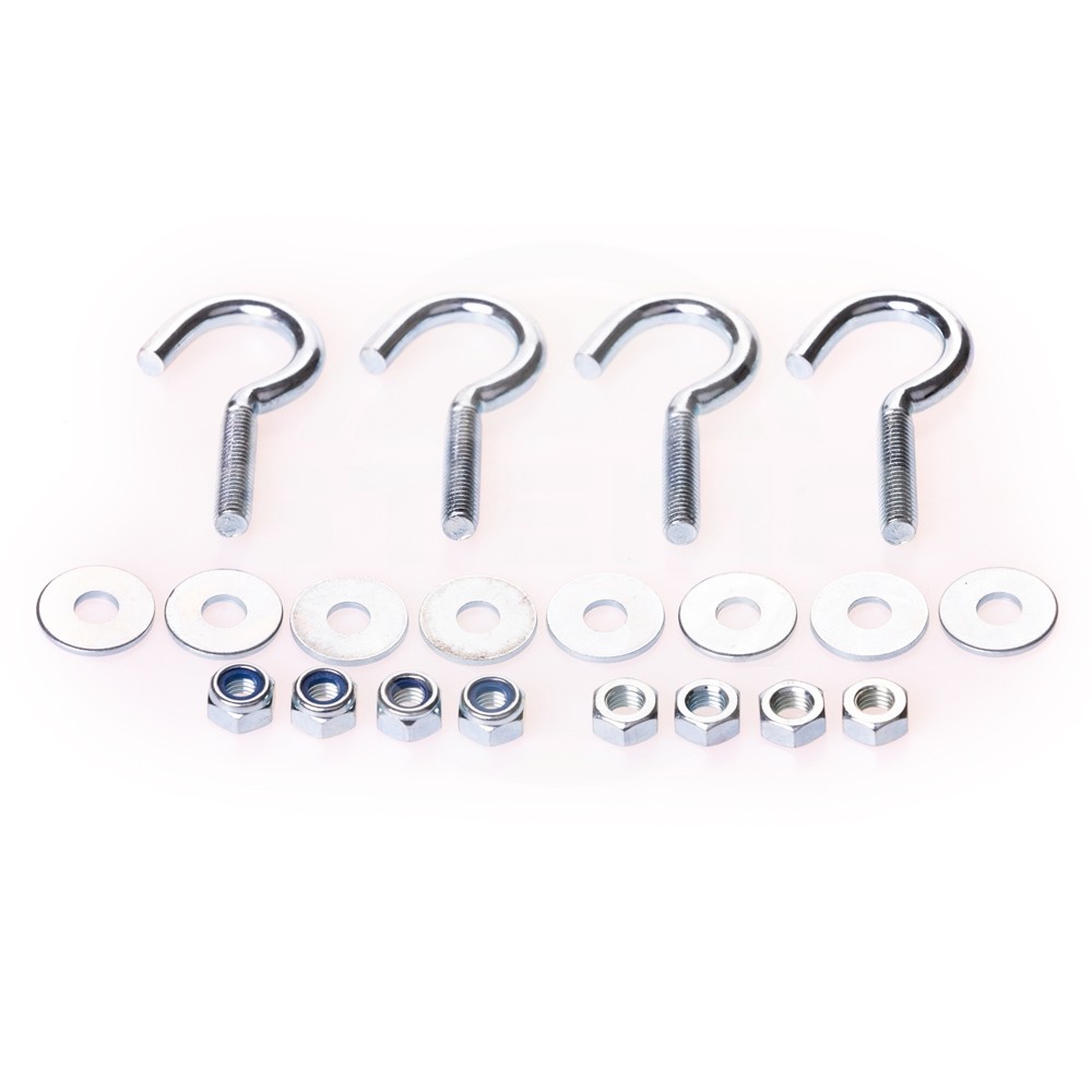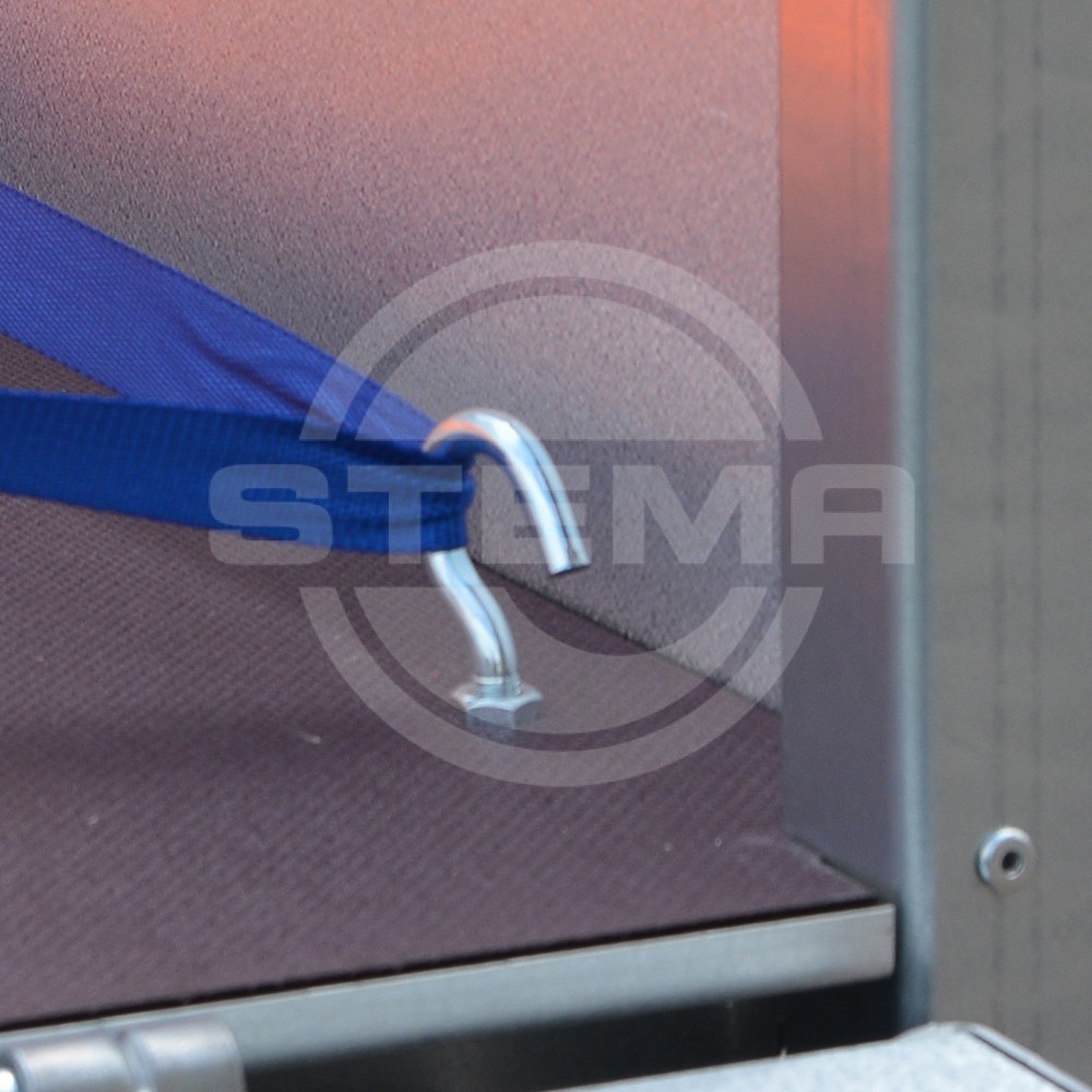 The set consists of four bent and galvanised screw hooks, which serve as lashing points in the trailer. These are mounted directly into the box corners of the wooden floor. The load capacity per hook is max. 50 daN (approx. 50 kg). The lashing angle is approx. 45°.