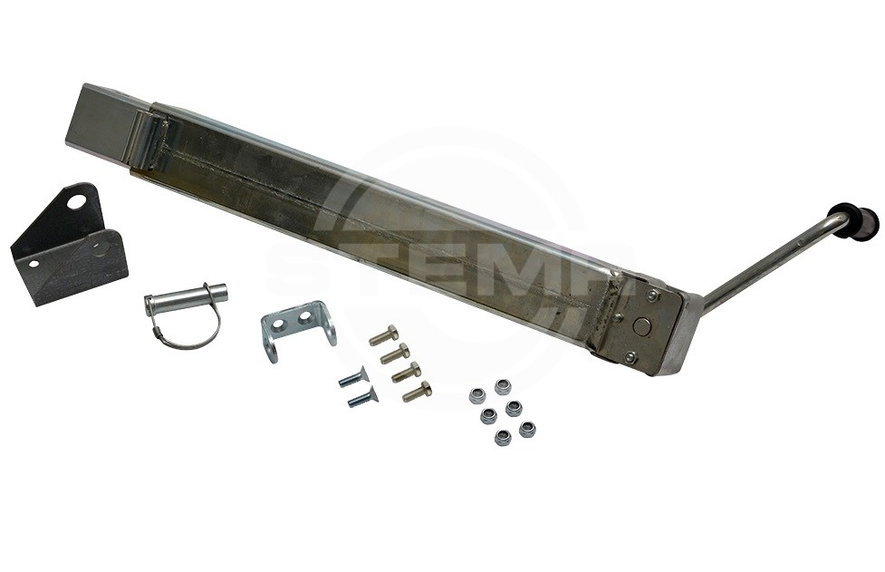 The telescopic support made of galvanised sheet steel is used for subsequent attachment to a dump trailer. It is mounted on the front crossbeam.