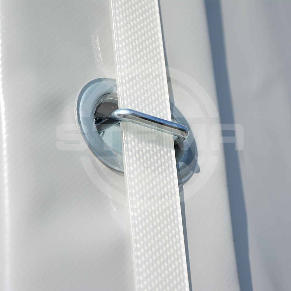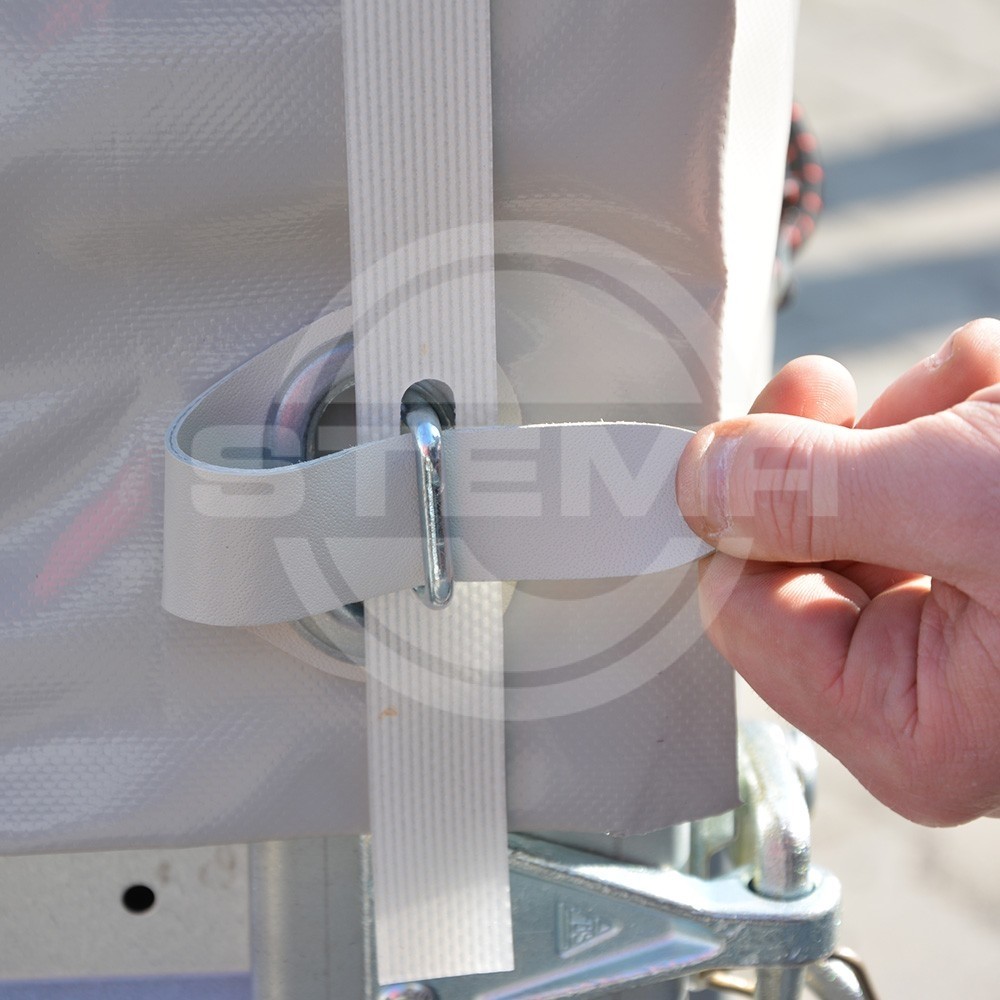 To minimise dirt adhesion, the glossy side is on the outside. The inside is matt and structured by a stabilising fabric inlay. Another impressive feature of this tear-proof material is its resistance to cold of up to -40 degrees Celsius and heat of up to +70 degrees Celsius. Our PREMIUM covers are sewed and welded, so that no water can infiltrate the loading area. The cover can be attached with 8 mm thick expander cord directly on mounting knobs or with mounting hooks on the aluminium side panelling.