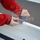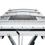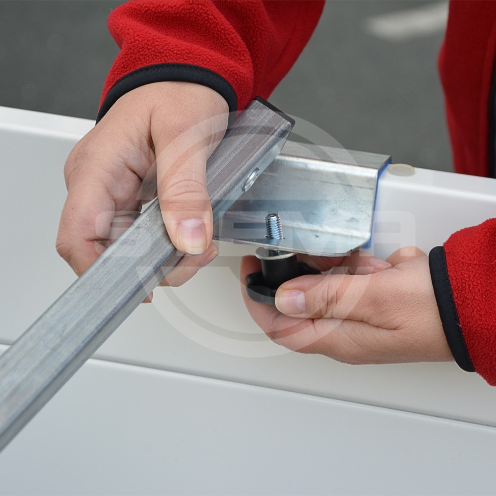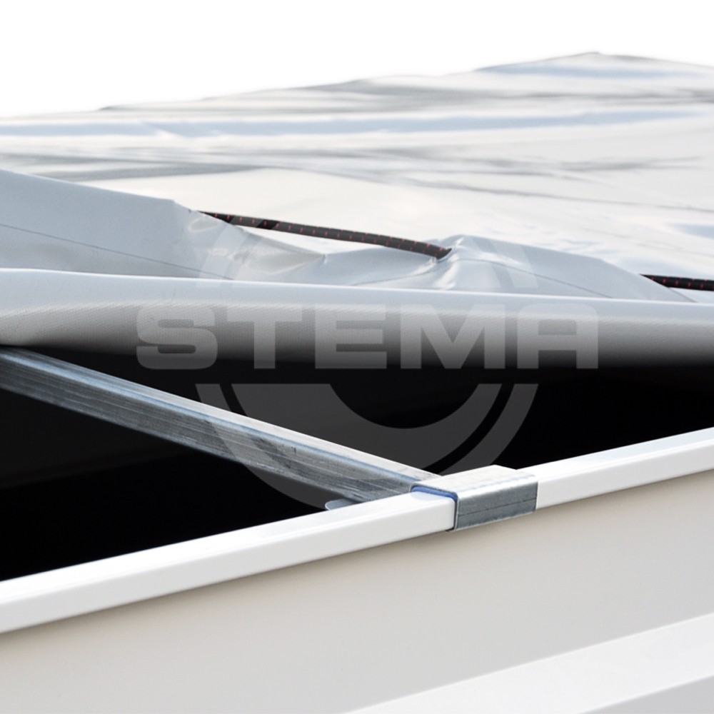 The flat cover support made of galvanised steel sheet is for stabilising the flat cover. With internal box widths greater than 128 cm, the supports are screwed onto a bracket. With the smallest version for trailers with a width of 108 cm, mounting is only possible with a center support! The suitable mounting material is included in delivery.